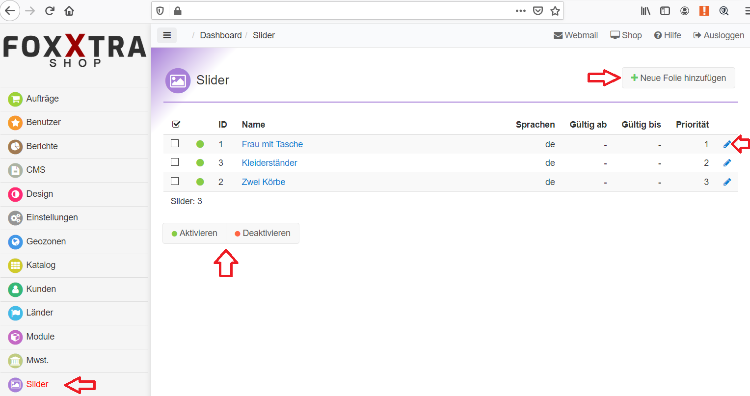Sie haben die Möglichkeit Slider zu aktivieren und zu deaktivieren.